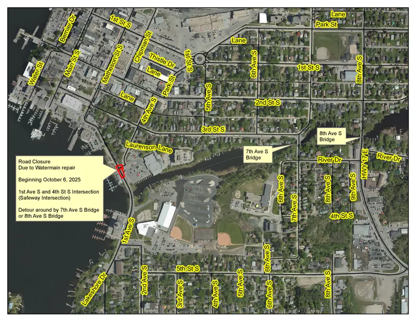 Please be advised that the intersection of First Avenue South and Fourth Street South will be closed to all traffic beginning Monday, October 6, at 8:30 a.m. for a watermain repair.